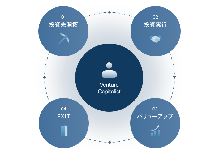 投資先開拓では、出資先候補となるスタートアップ企業を探すために、あらゆる情報源から企業をリストアップし、コンタクトを取ります。社会課題・国内外のビジネストレンド・最先端の技術動向といったマクロ視点と、日常に溢れている個人・企業の様々な不やニーズといったミクロ視点の両方を以て、有望な分野・領域・市場を読み、投資するか否かを検討します。キャピタリストとして実績を積む中で培っていく幅広いネットワークも重要となります。